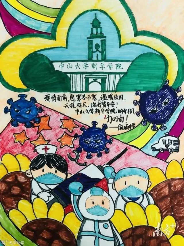 “哥哥姐姐加油,我们一起战胜病毒。”麻涌中学学生绘画为广州新华学院加油。