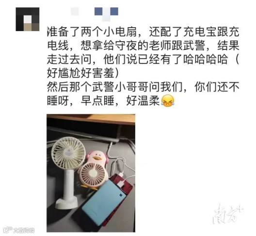 “这些天,每幢宿舍都有24小时值班的工作人员。我们被保护得很好,家人不用挂念。”广州新华学院(东莞校区)学生用手机拍下的宿舍门前“守护者”流传到网上,感动了不少人。