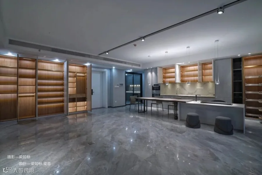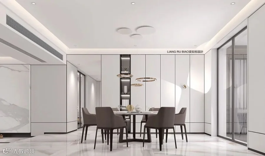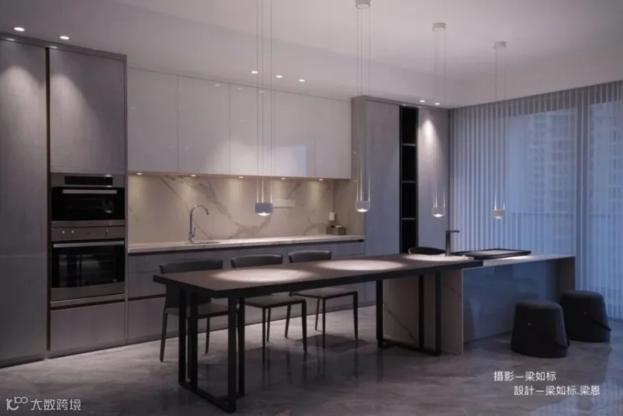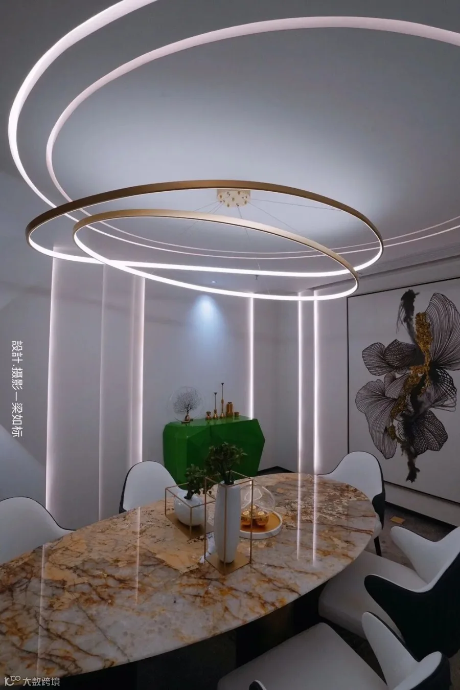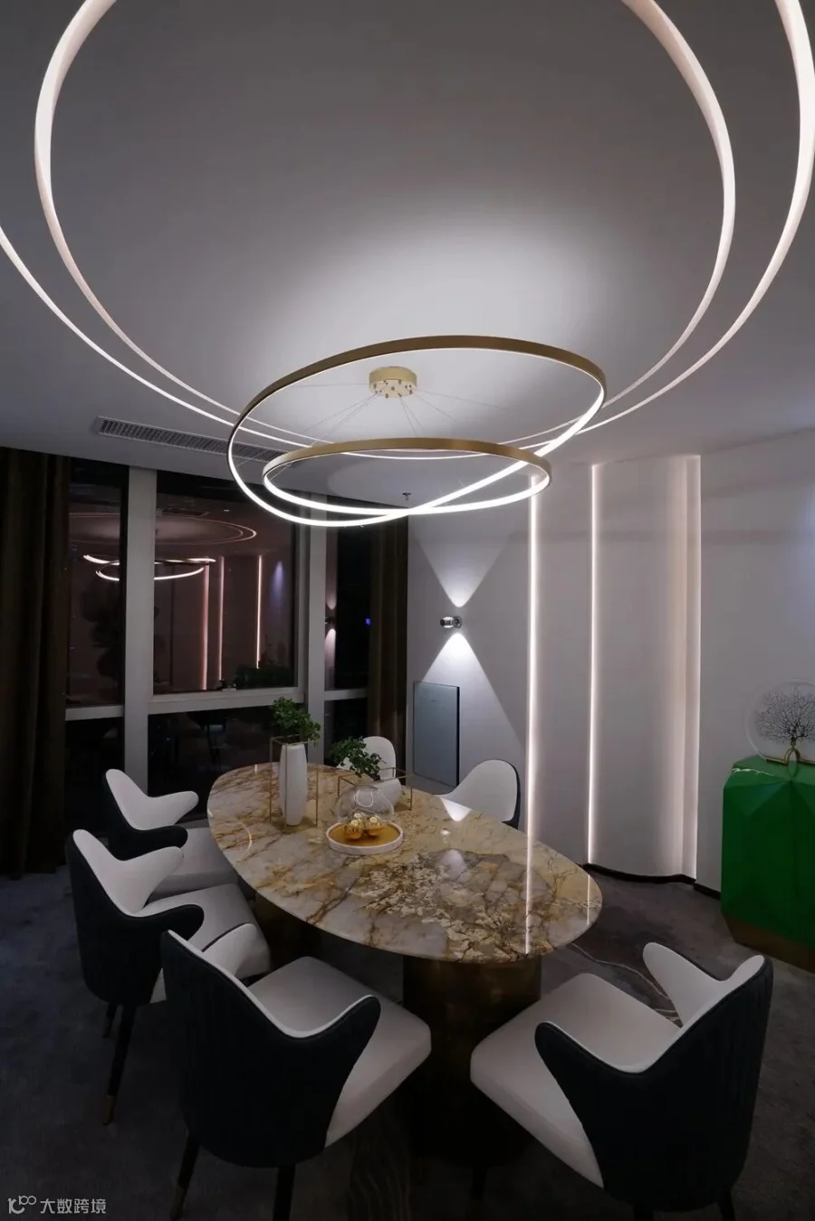 餐厅是独属于一家人的美味时光。储物柜加粗竖向线条分割空间,与圆形餐桌造出视觉层次感,映照方与圆的人生哲理,品尝世间百态美味。