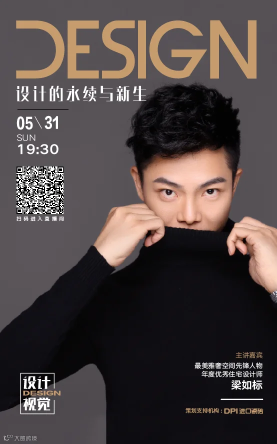 2020年5月31日19:30,由DPI进口瓷砖策划支持的《设计视觉》,本期将邀请到德馨装饰总监设计师梁如标老师走进直播间,与大家分享关于商业接待室、高端奢宅等空间的设计,梁老师将带着他十几年的从业经验,以及优秀的案例作品,透过他独特的设计视觉,并融合美术、摄影等一切关于美的艺术创造,与您展开深入的交流、探讨,欢迎广大设计师、业主朋友关注直播间,一起互动、分享。