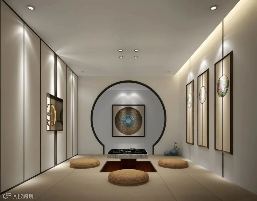通过中国古典的月门造型,以大面积浅色背景为基调,搭配浓烈中国特色元素做点缀,构成了宁静雅致却不乏味的空间,充分彰显了主人对生活的品味和态度。