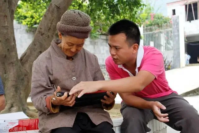 志愿者吴道杰(右一)在教老人使用收音机。