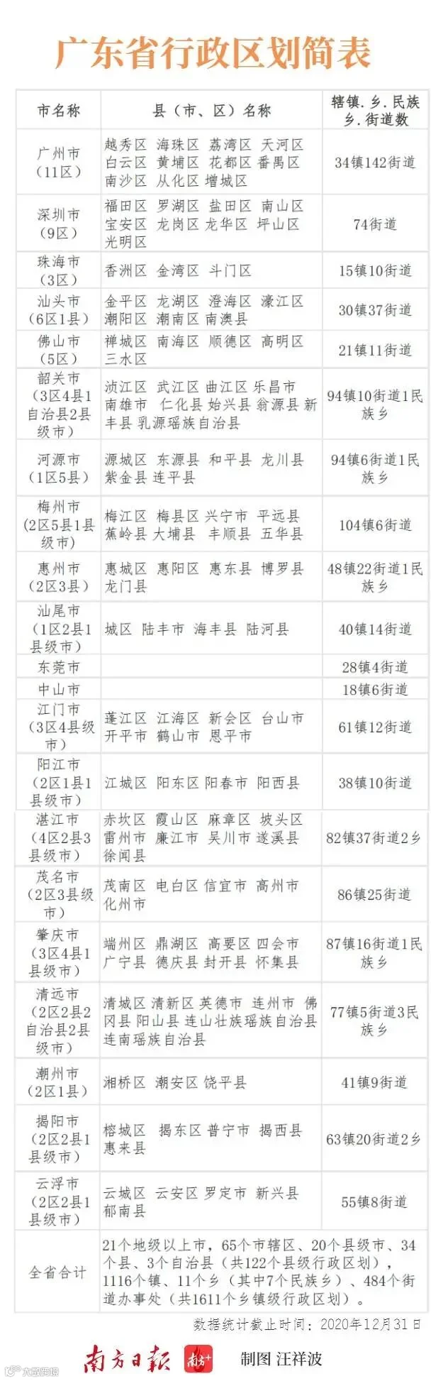 该简表显示,截至2020年12月底,广东全省共有21个地级以上市,65个市辖区、20个县级市、34个县、3个自治县(共122个县级行政区划),1116个镇、11个乡(其中7个民族乡)、484个街道办事处(共1611个乡镇级行政区划)。