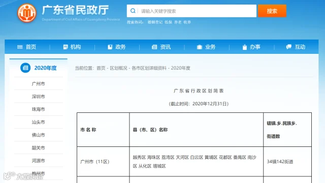 日前,广东省民政厅在官网上公布了2020年度的广东省行政区划简表。