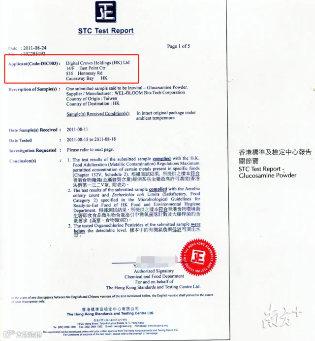 他们还发现,Francine公司经销商提供的Inovital品牌保健品的产品资料中,检测报告中送检单位均显示为“亮碧思集团(香港)有限公司”。