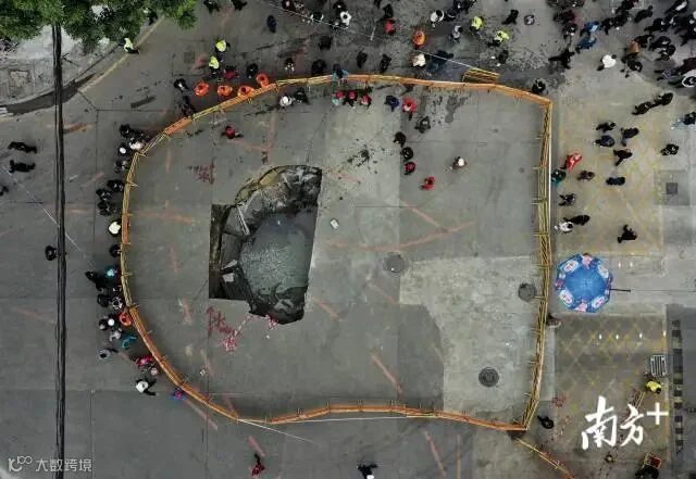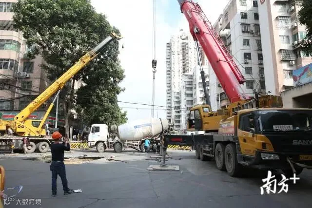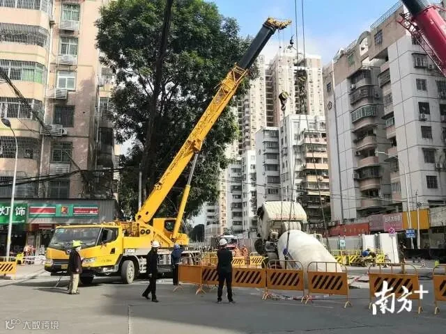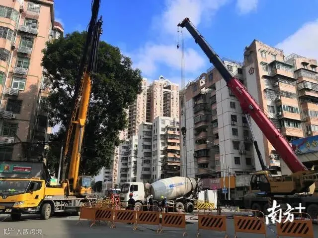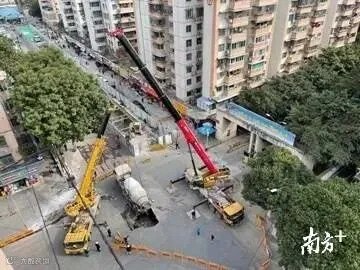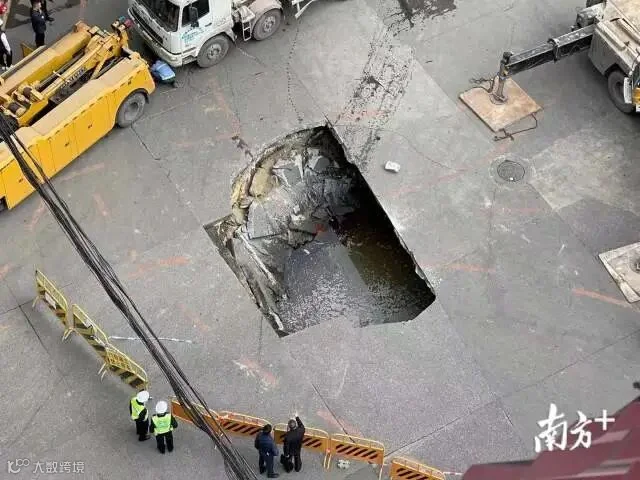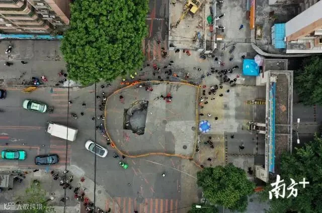 上午10时许,南方+在广州棠德西路地陷现场看到,目前泥罐车已从地陷坑中吊起。然而,从高处俯看,现场仍留下一超1米的大坑。截至发稿时,现场围蔽仍未解除,施工人员仍在现场做进一步处理。