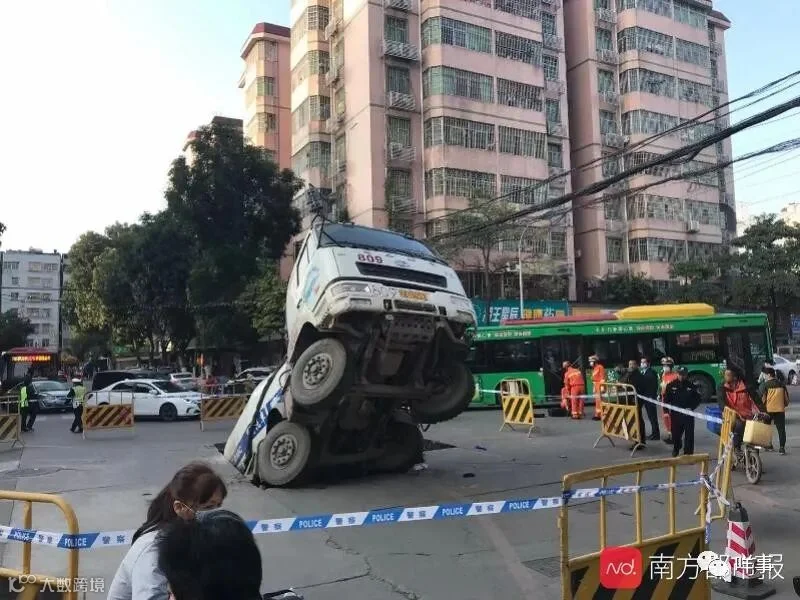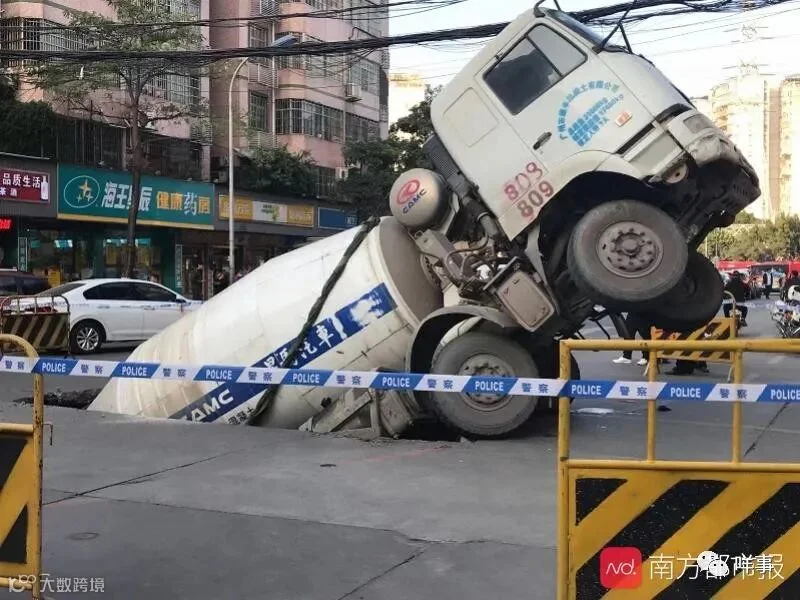 据了解,地陷发生时,周围并无其他车辆,泥罐车司机也已脱困。