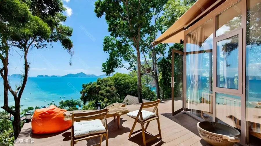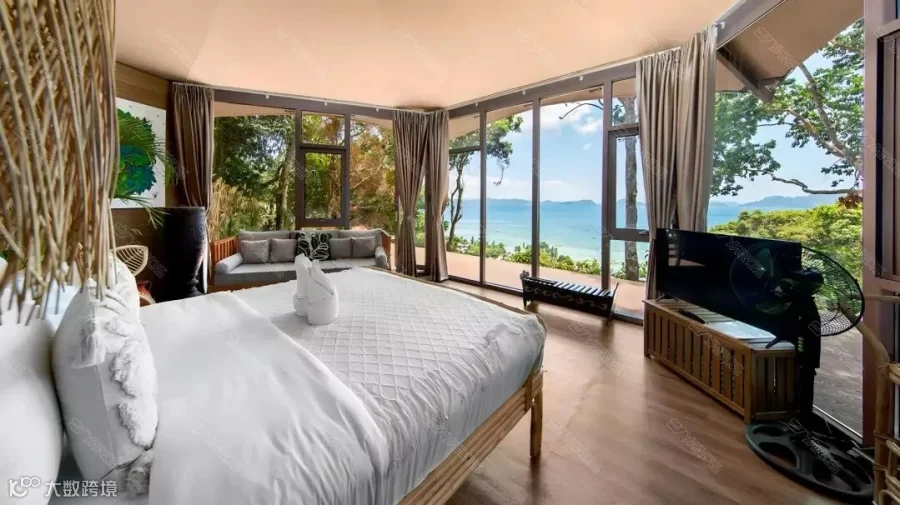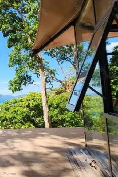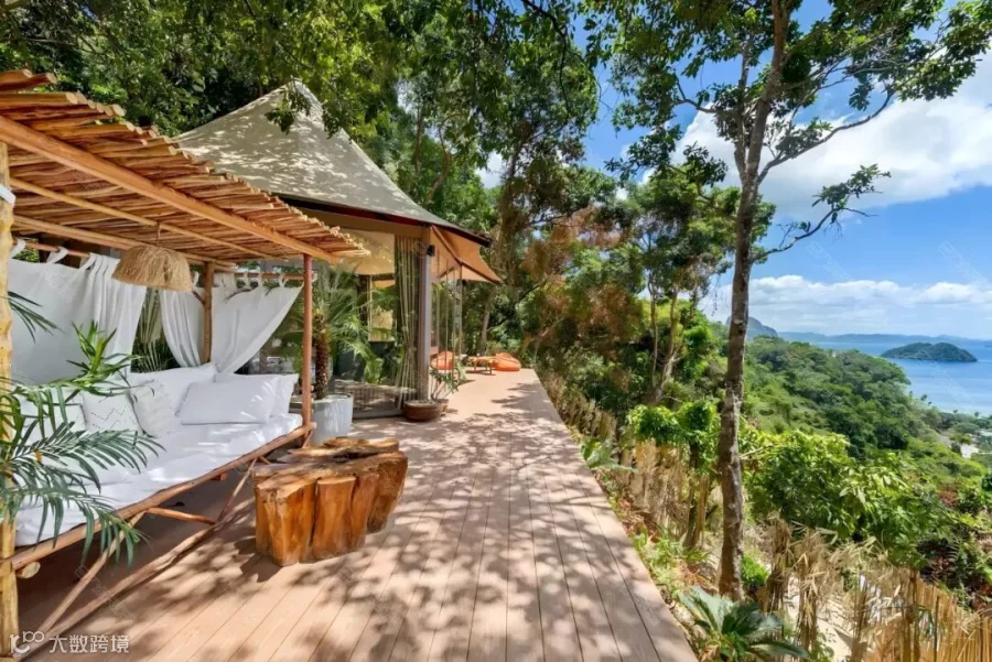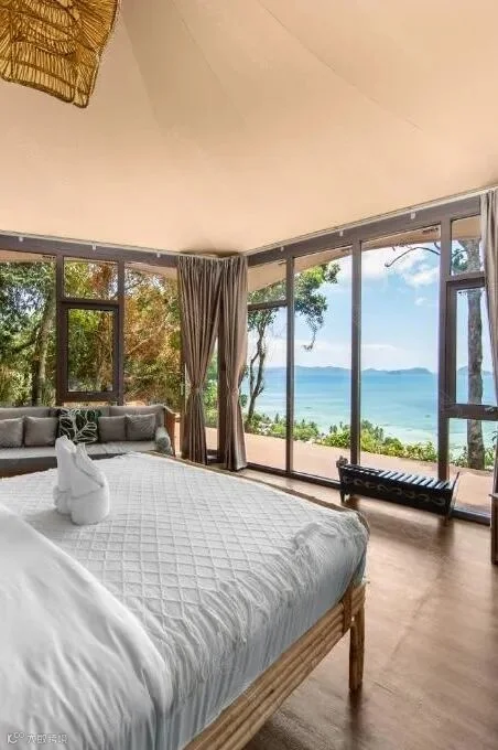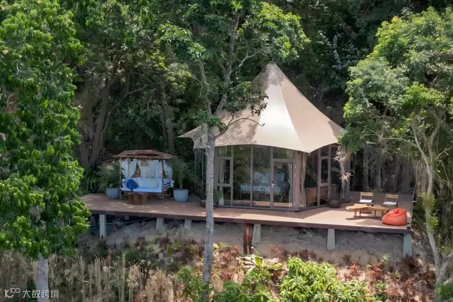 丛林小屋采用能够适应岛屿地势落差的酒店帐篷,坐拥半山观景位,全景落地窗奢享开阔视野。