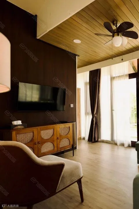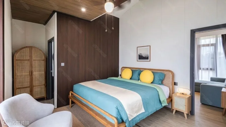 室内装饰更具现代风格,用蓝绿黄三色点亮整体装饰,在木质调的基础上加入大量的藤编元素,如衣柜、电视柜、椅子等。