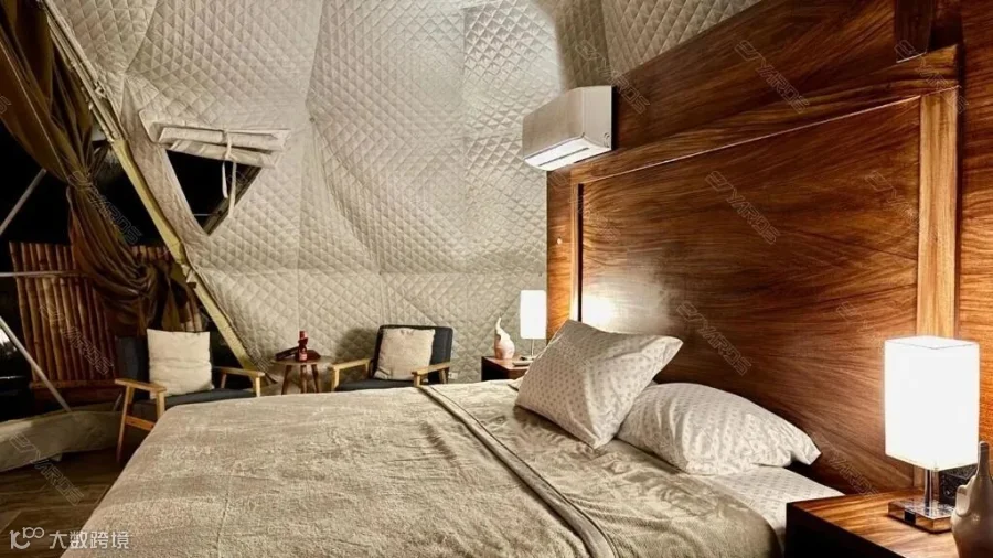 酒店由3座星空帐篷组成,整体融合了“精致露营+现代自然风”,搭配空调、独立卫浴等现代设施,室内装饰以极简主义风格为主,选用纹样简单的床品、靠枕、灯饰、茶几桌椅,打造一处野趣与舒适共存的度假胜地。