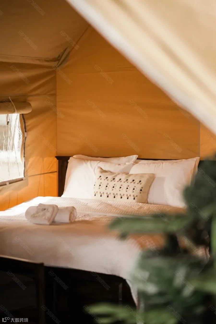 每座帐篷均配备地暖、风扇等现代化设施,床品选用的五星级床垫和床单,搭配手工定制红木类木材家具、吊灯、绿植等室内装饰,将户外露营的自然野趣与星级酒店的奢华质感巧妙糅合,营造出精致的野奢新范式。