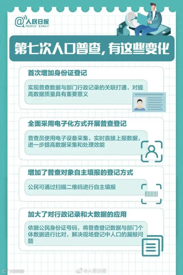 据了解,第七次全国人口普查将首次采集普查对象身份证号码,以实现与公安、卫健等部门行政记录的比对核查,确保数据的真实性准确性。此外,这次普查还将运用大数据开展比对核查,确保数据质量。