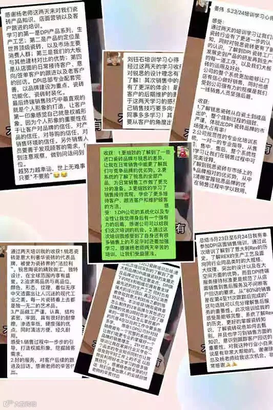培训的主题以品牌、产品知识、产品搭配应用、陶瓷大板营销、渠道业务指引等基础知识为主,通过DPI产品如何从生产—销售—应用过程的透析,学员们获益匪浅,在系统的串联下掌握培训的内容要点。