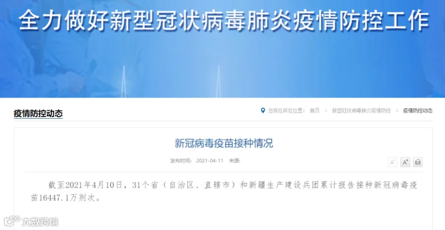 国家卫生健康委员会官网消息:截至2021年4月10日,31个省(自治区、直辖市)和新疆生产建设兵团累计报告接种新冠病毒疫苗16447.1万剂次。