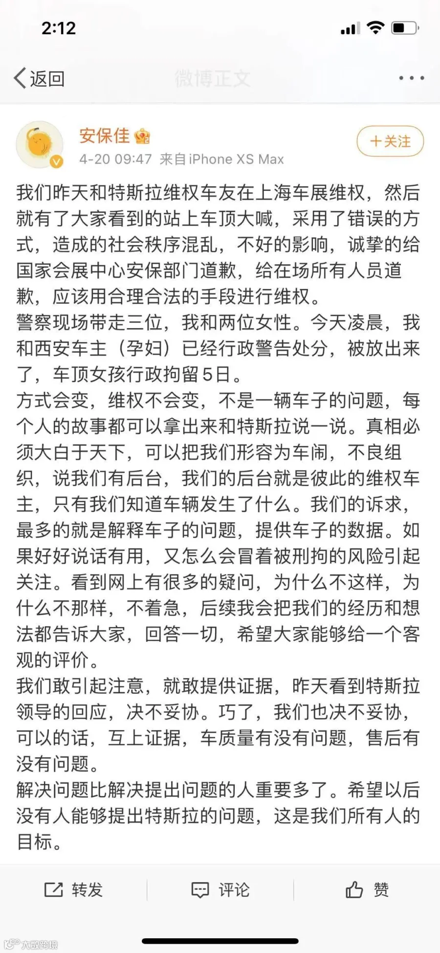 4月20日,参与特斯拉展台维权的一位当事人@安保佳发布微博表示,为采用错误的方式,造成的社会秩序混乱,不好的影响,诚挚的给国家会展中心安保部门道歉,给在场所有人员道歉,应该用合理合法的手段进行维权。