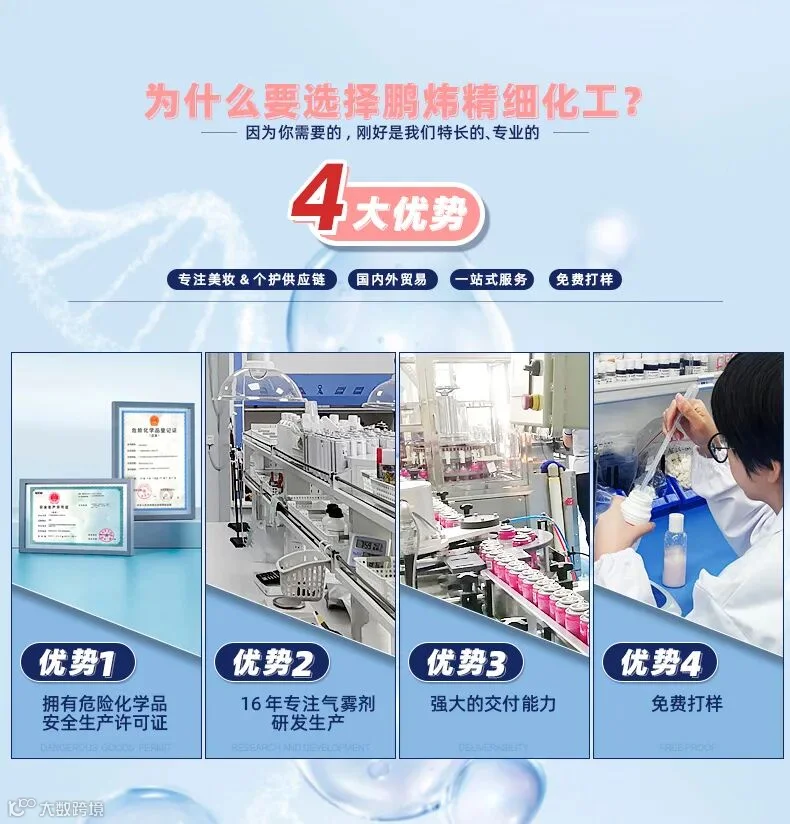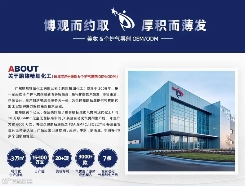 广东鹏炜精细化工有限公司是一家专注于美妆气雾剂产品的研发、设计、生产及销售的高新技术企业。