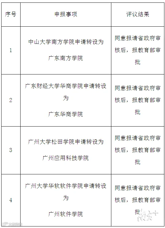 该公示指出,经省高等学校设置评议委员会专家考察和评议,同意按程序将中山大学南方学院转设为广东南方学院、广东财经大学华商学院转设为广东华商学院、广州大学松田学院转设为广州应用科技学院、广州大学华软软件学院转设为广州软件学院的申报材料报请省政府审核后,报教育部审批,并将省高等学校设置评议委员会评议结果向社会公示。