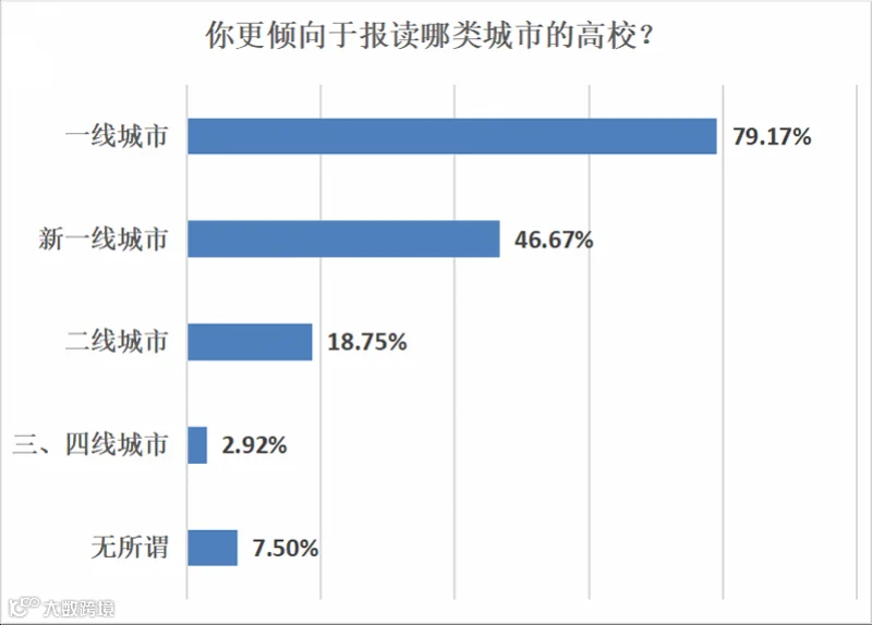 进一步分析发现,华南和华东地区受考生欢迎的原因除了高校资源集中外,还有经济发达、交通便利等因素。79.17%的受访考生更倾向于报读北、上、广等一线城市高校,考虑新一线城市的也有46.67%;但有意选择二、三、四线城市的考生则只有大约两成。