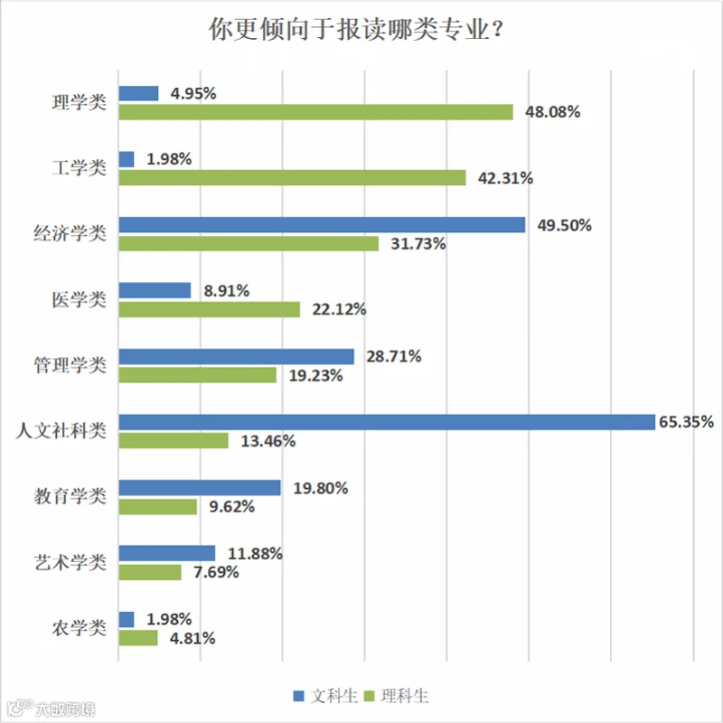 受访理科考生方面,则有48.08%有意报读理学类专业,42.31%对工学类专业感兴趣,也有31.73%倾向于选择经济学类专业。不难看出,经济学类专业在两类考生心目中都备受青睐。