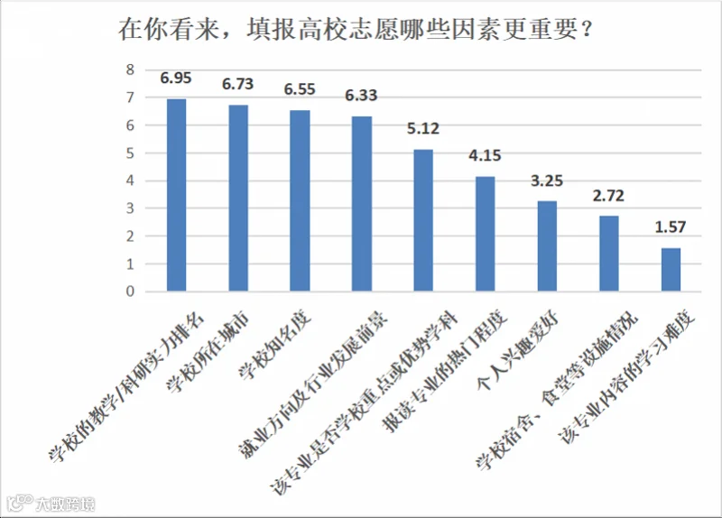 除了应届考生外,本次调查还向在校大学生们咨询了过往的一些填报经验。问及受访的高校学生认为哪些因素在志愿填报中更重要时,学校的教学水平、科研实力排名依然是排在首位的考虑因素,平均综合得分为6.95分;紧随其后的是学校所在城市和知名度,分别得6.73分和6.55分;专业的就业方向及发展前景也得6.33分。