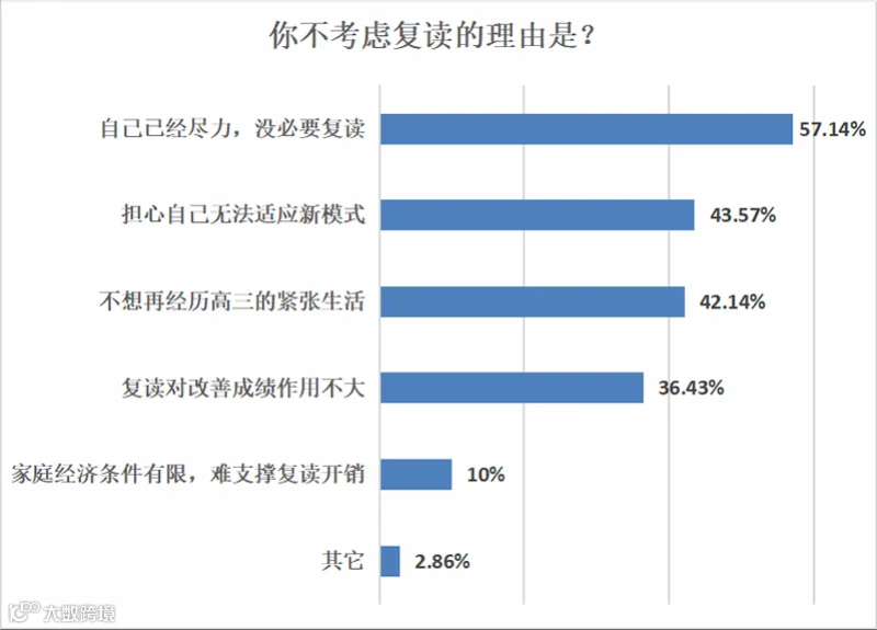 不打算复读的受访考生中有57.14%表示,即便成绩不理想,这已是自己尽力的结果,没必要复读;同时有43.57%对明年的新高考模式感到忧虑,担心复读后成绩可能更差;也有42.14%表示不想再经历一次高三的紧张生活。