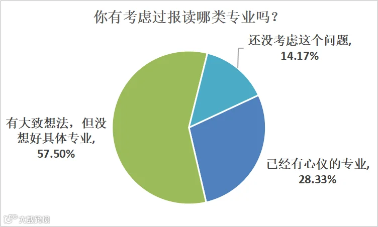考虑好打算报读的高校,下一步就是思考填报哪些具体专业了。本次调查中,28.33%的受访考生表示已经有心仪的专业,57.50%表示已有大致想法,但也有14.17%表示还没考虑这个问题。