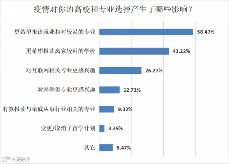 具体问及产生了哪些影响时,58.47%的受访考生表示目前更希望报读就业相对较易的专业;也有43.22%放弃外地求学的计划、打算报读离家较近的学校;26.27%看中疫情期间进一步加速发展的互联网行业,对互联网专业更感兴趣。