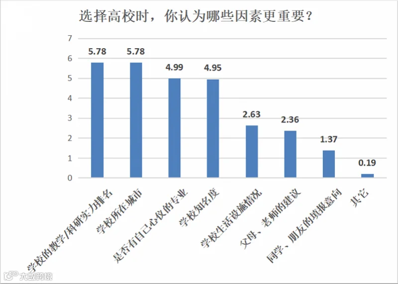 在选择意向高校的众多因素中,受访考生最看重的是学校的教学水平、科研实力排名和所在城市,两项的平均综合得分均为5.78分;其次是该校是否有自己心仪的专业,得分为4.99分;学校知名度的得分也有4.95分;而学校生活设施、父母老师建议、同学朋友填报意向等因素的重要性则相对较低。