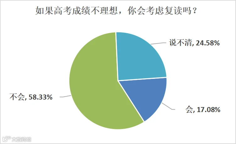 调查结果显示,只有17.08%的受访考生明确表示在成绩不理想的情况下会复读,58.33%没有复读的打算,还有24.58%表示说不清。