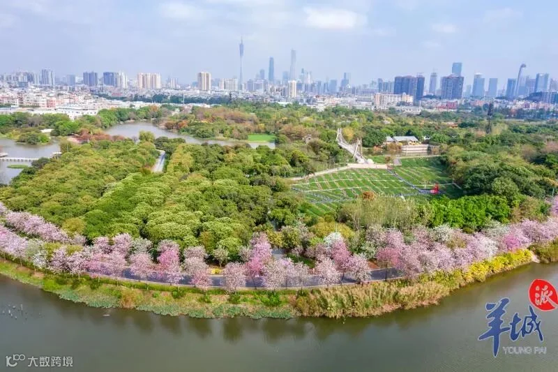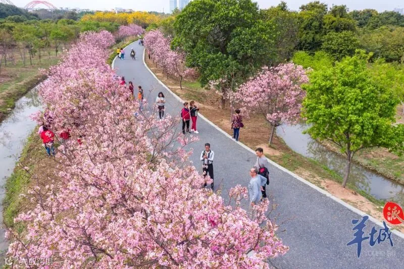 为优化树木品种,提升植物多样性和观赏性,海珠湿地数年前引进了近千株适宜广州气候的樱花树,经过前几年的科学养护,今年湿地樱花全面盛开,密密匝匝挂满枝头。