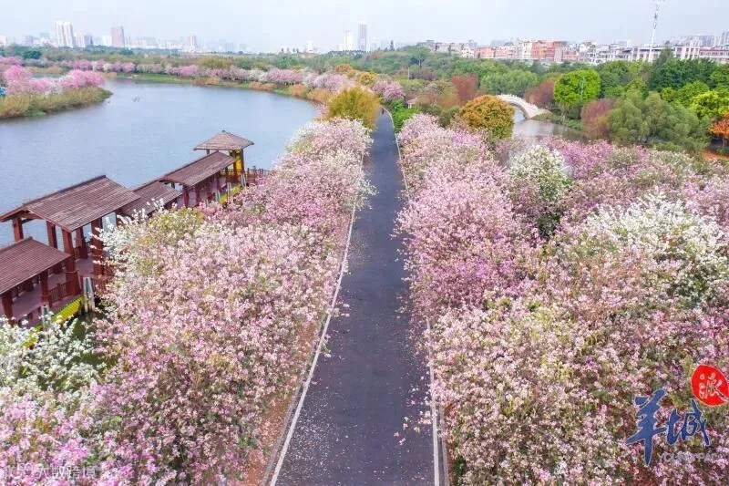 2月底,海珠湿地数千株宫粉紫荆争相怒放,共同绘制成一场长达3.2公里的粉色梦境。这条“宫粉紫荆大道”位于海珠湿地一期与二期的石榴岗河沿岸。花开时节,一片粉霞,在紫荆花下漫步,就像置身于童话世界。