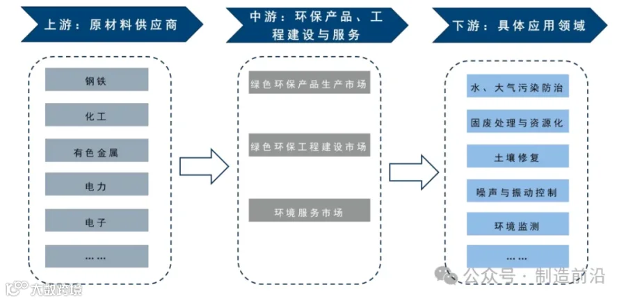 中游:环保产品、工程建设与服务,涵盖绿色环保产品生产市场、环保工程建设市场、环境服务市场等;