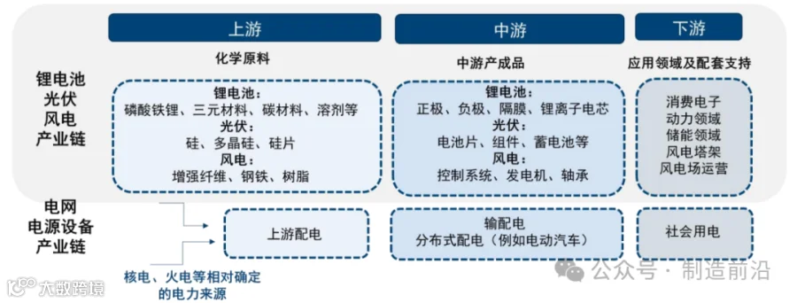 上游:包括原材料供应商和零部件制造商。这些供应商提供生产新能源技术装备所需的原材料和关键零部件,如稀土元素、硅材料、电 池正负极材料等;