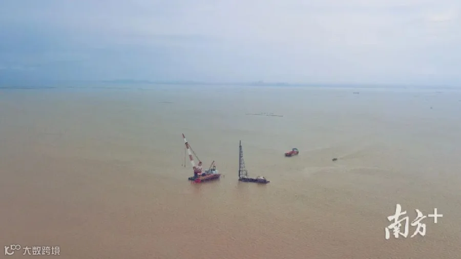 图为黄茅海海域,保利长大黄茅海跨海通道T2先行标正在施工。