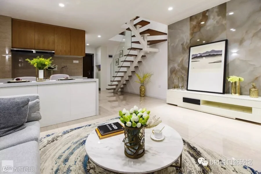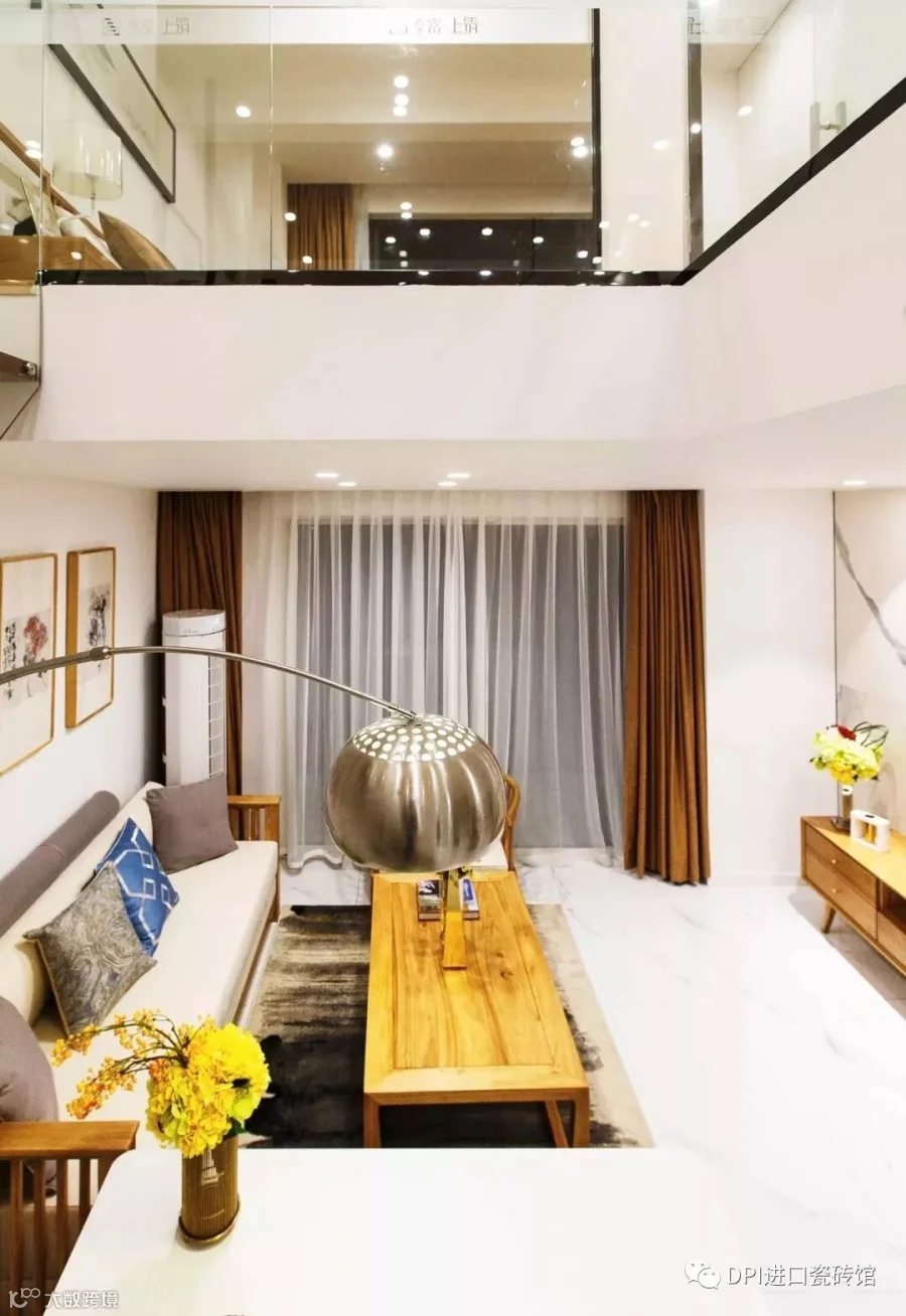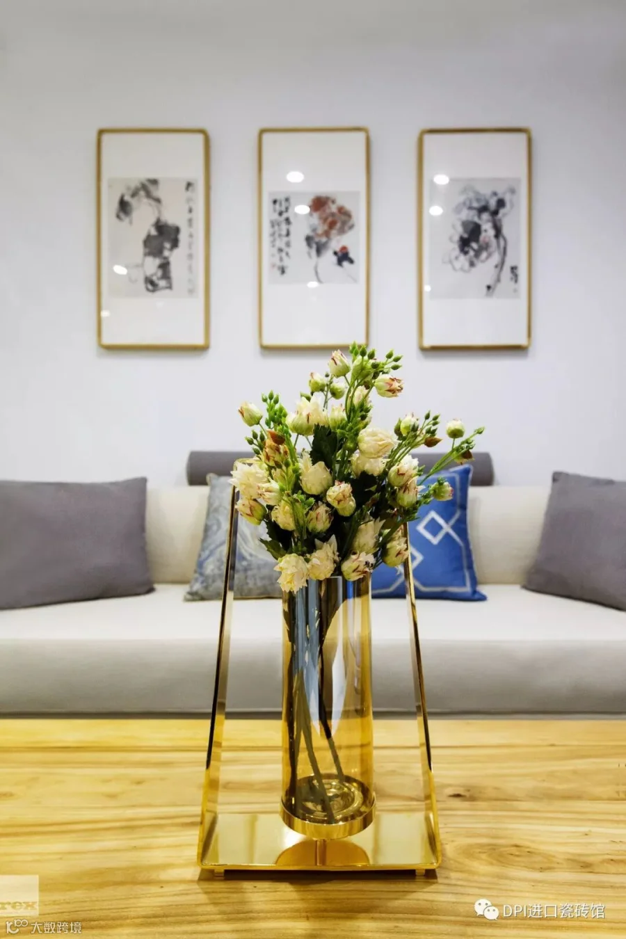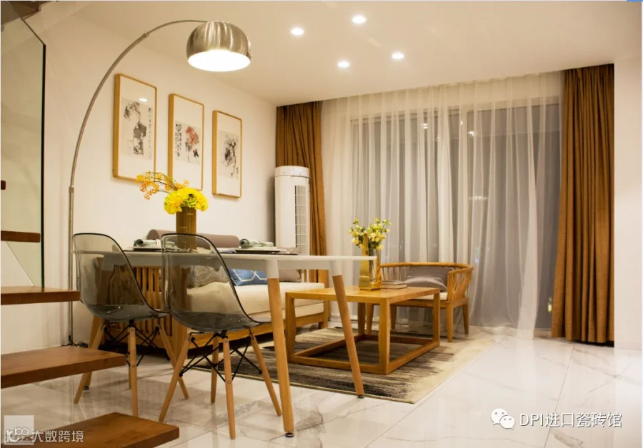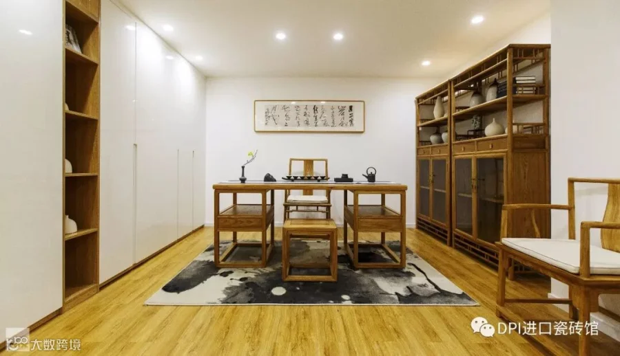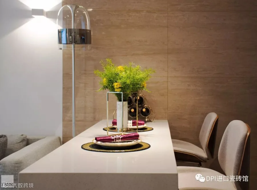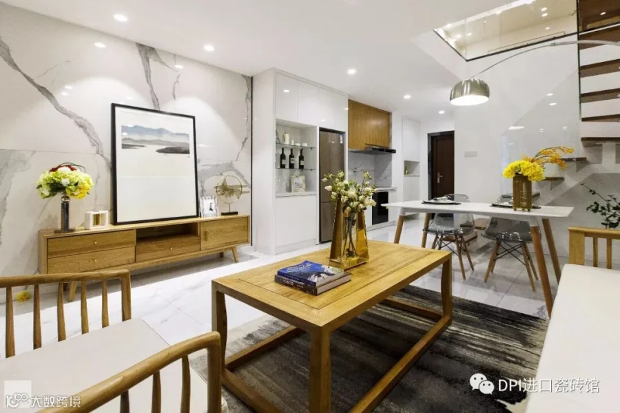 装饰墙面的是意大利原装进口锐思大规格瓷砖,淡淡的咖色与室内木色呼应,温暖而高级;瓷砖飘逸流动的纹理,又为沉稳的空间注入了一丝丝灵动。