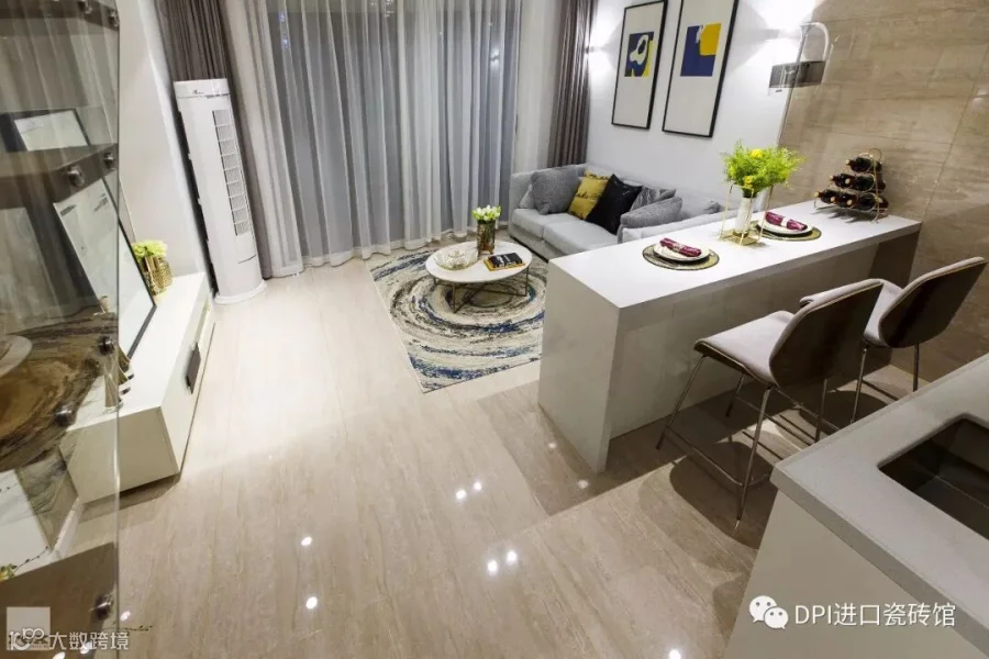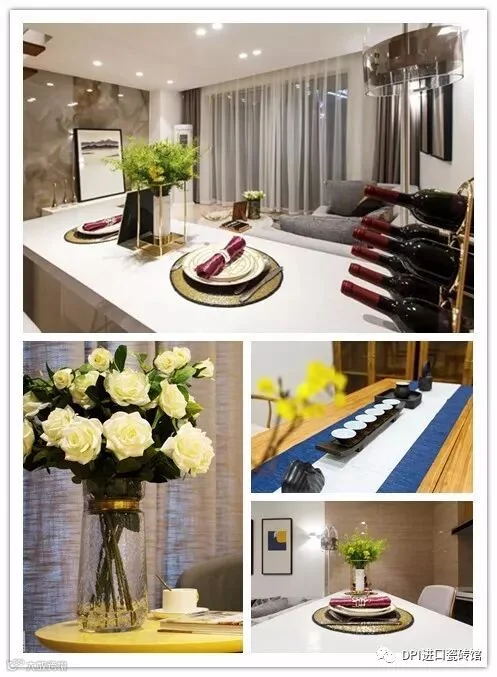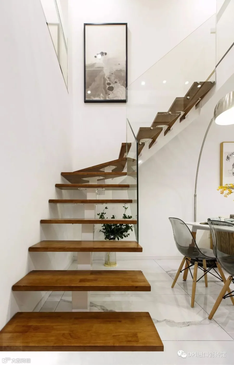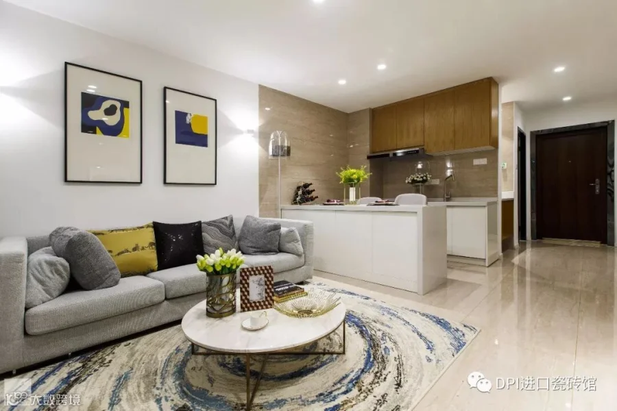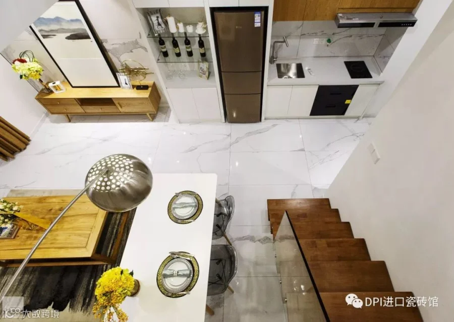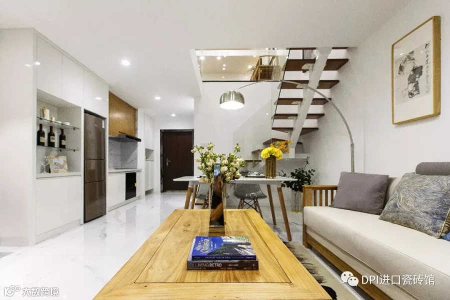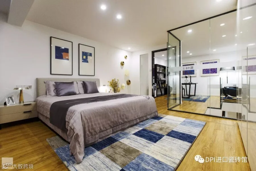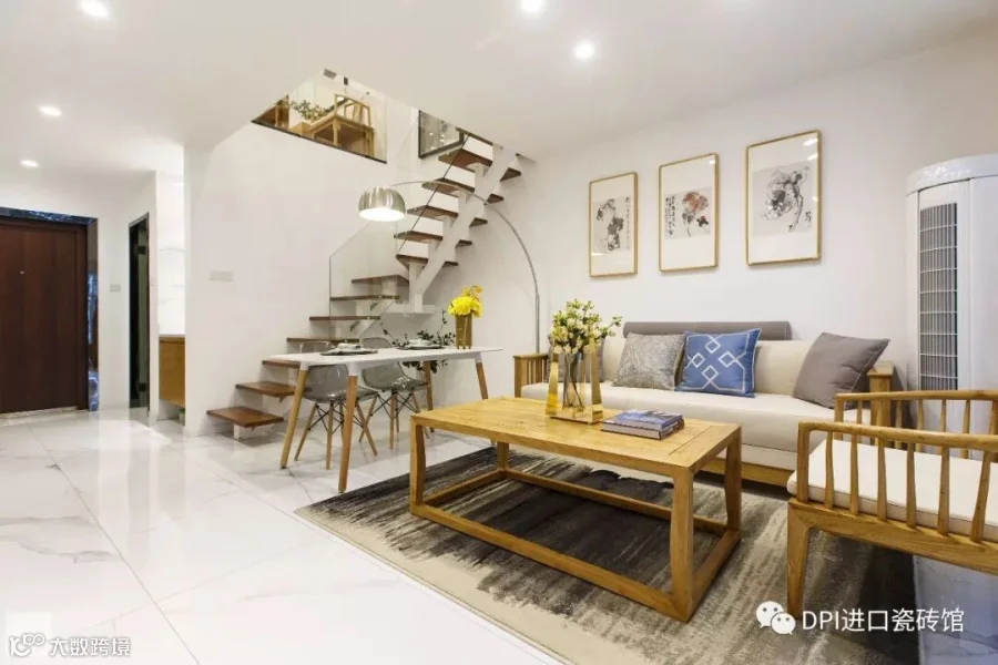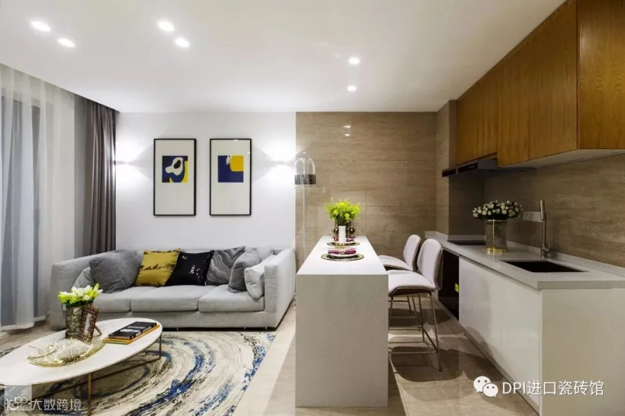 装饰墙面的是意大利原装进口锐思大规格瓷砖,淡淡的咖色与室内木色呼应,温暖而高级;瓷砖飘逸流动的纹理,又为沉稳的空间注入了一丝丝灵动。