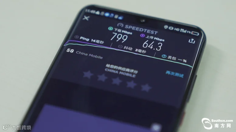 在广州移动的5G展厅测速结果显示,5G下载速度可达799Mbps,上传速度为64.37Mbps。
