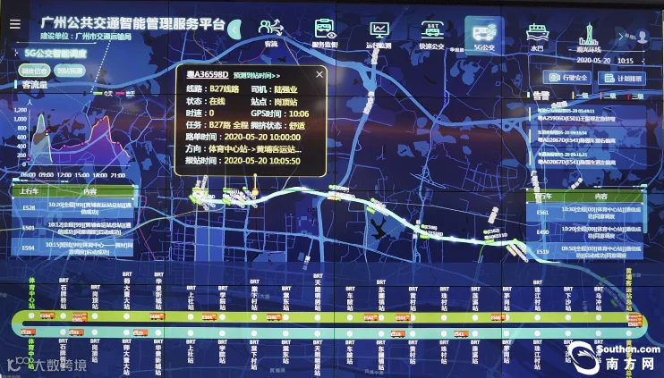 位于广州市交通运输局指挥中心的广州公共交通智能管理服务平台,正报告着当天公共交通的客流量、运行状态。点击5G公交页面,B27路每辆公交车的实时位置、车辆运行指标分析、安全驾驶预警提醒等信息一目了然。