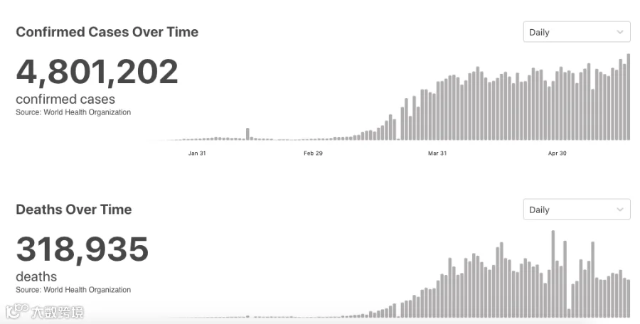 世卫组织最新统计数据显示,全球累计确诊新冠肺炎病例 4801202 例,累计死亡病例318935例。过去24小时新增确诊病例106662例,世卫组织总干事谭德塞20日表示,这是自疫情暴发以来最多的一天,其中近三分之二来自四个国家。