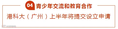 在高等教育合作上,支持香港高校来粤合作办学。目前,香港科技大学(广州)正在全面推进校园建设、学科设置、科研合作等筹建工作,合作双方计划今年上半年提交正式设立申请。香港城市大学在东莞、香港公开大学在肇庆合作举办独立法人资格大学的筹设工作已按程序报教育部审批。今年,广东21所高校将招收香港中学文凭考试学生,3月1日起统一报名。