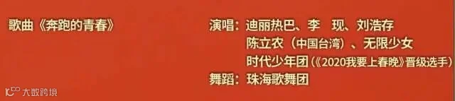 多个歌舞类节目中均有来自广东的歌舞团伴舞的身影。迪丽热巴、李现和刘浩存共同演绎的歌曲《奔跑的青春》,热力四射的歌舞中有
