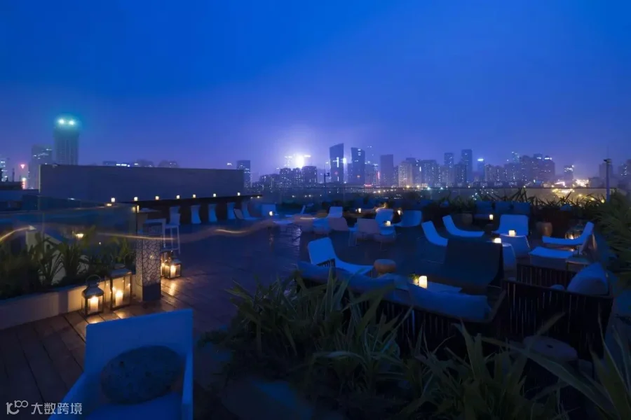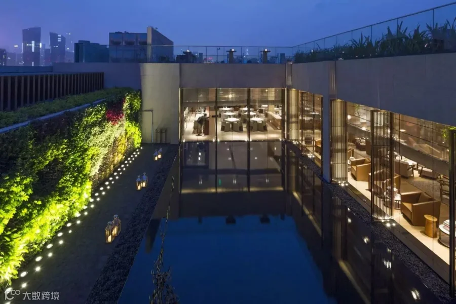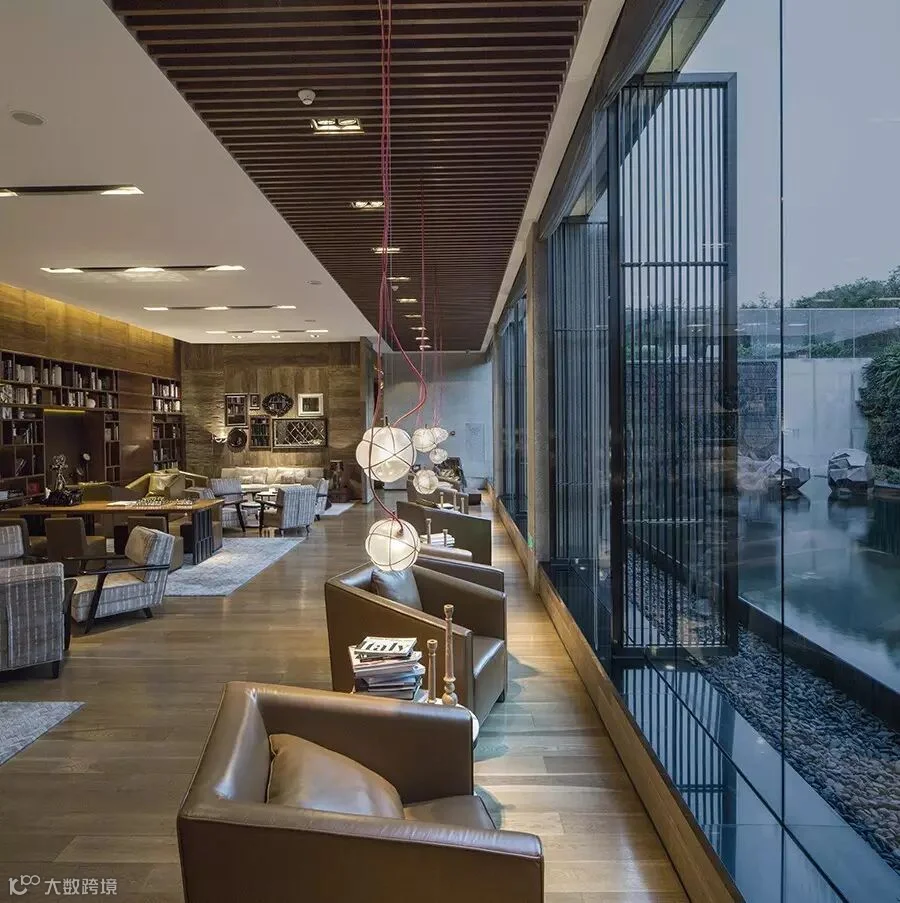 空间中一步一景,鲜活翠绿的墙面绿植、精心挑选的黑松、低调简单的哑光石材、波光粼粼的顶楼水面、质朴自然的木面材料……将自然界神秘悠远的天地灵气带到酒店空间中,让人仿若置身旷阔林间。六楼至顶层的部分空间被打通,构建下沉式的室内庭院景观,并引入时下流行的书吧,让宾客在自然雅致的环境中获得身体与心灵的双重享受。