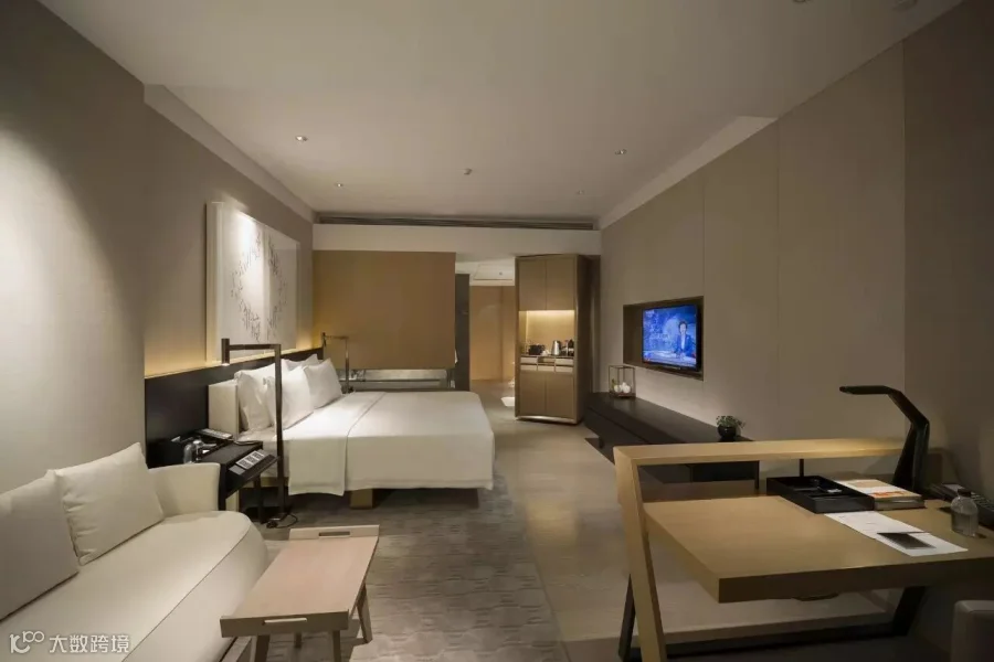 酒店整体设计以新东方文化元素为主,并通过中西组合的家具、陈设以及中国当代艺术品的巧妙装饰,呈现出静谧自然的中国东方美学气质。大堂设计中,整面绿色墙植与一字排开的鸟笼,让空间去繁为简,加上清脆悠扬的鸟叫,让人有“蝉噪林逾静,鸟鸣山更幽”之感。酒店整体用色和谐统一,结合用心调试的每一束光源,让空间散发出宁静优雅的文化气质。