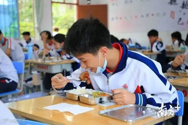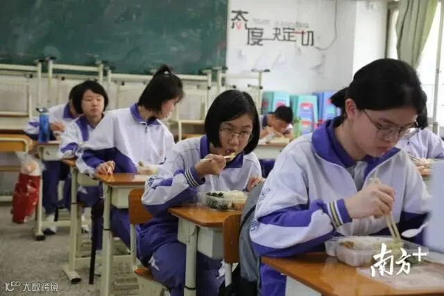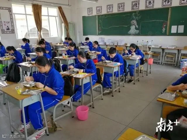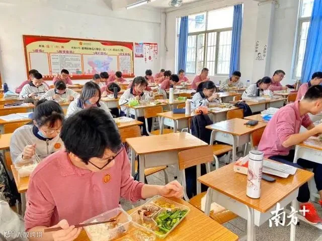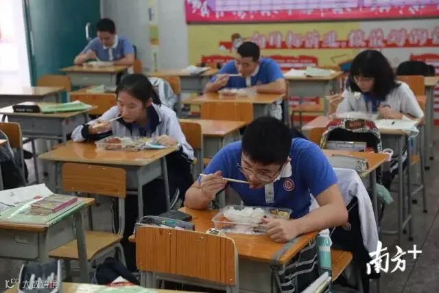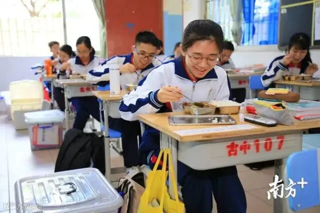 【广州市第十六中学】中午12:00,广州市第十六中学:中午就餐错峰,一部分学生在课室就餐。