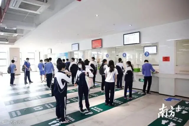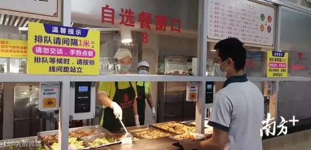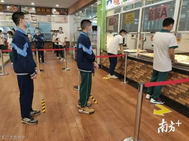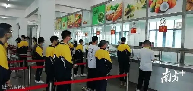 【惠州市第一中学】为了减少人员聚集,食堂内的每张餐桌被划分为4个格子小间。学生们要自备餐具,根据划分好的通道支付取餐。这次开学,一中还通过引入智慧校园中的刷脸支付,刷脸时无需摘口罩也可以识别,方便学生“无接触式”支付,提高就餐效率。