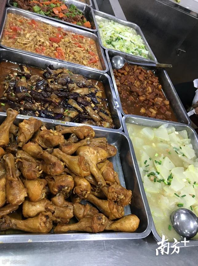 今天饭菜有烧鸭、咖喱土豆炒肉、腐皮虾卷炒菜花、炒油菜、豆豉蒸草鱼腹、黄豆干肉碎和紫菜蛋花汤,营养丰富。学生饭盒套餐标准是12元。