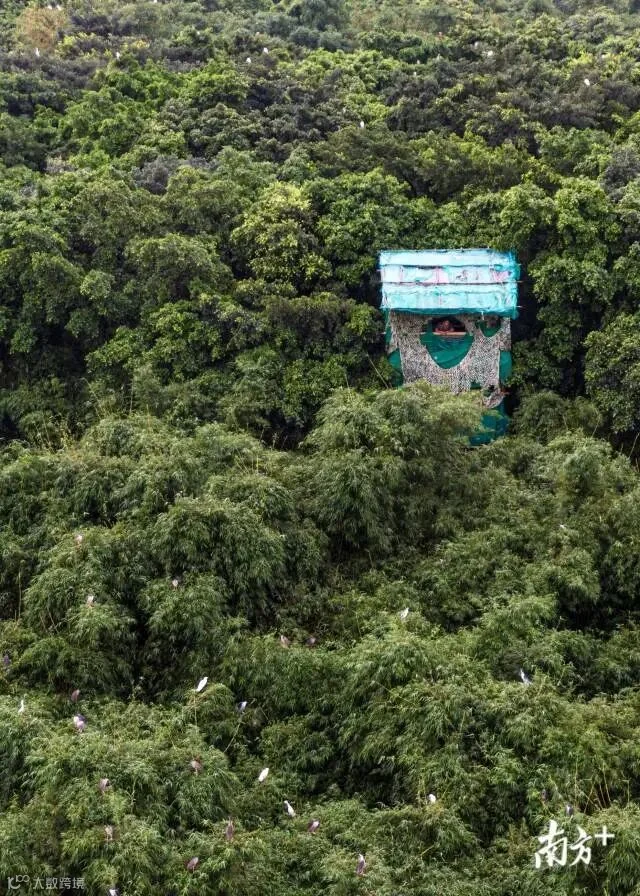 天刚亮,冼铨辉就骑着摩托车来到鹭园,巡查有没有落单受伤的鸟儿,竹子长势如何以及河道有没有淤塞,静谧的竹林只听得见鸟鸣声和流水声,直到天黑鹭鸟归巢,他会留宿在棚房,忍受蚊虫的叮咬。就这样日复一日,年复一年。