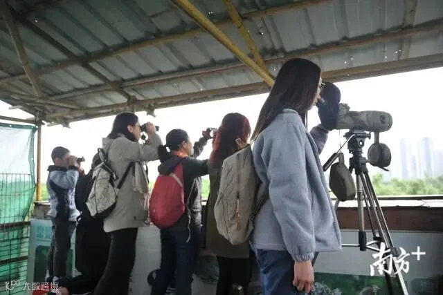 市民们在观鸟台观察鹭鸟。