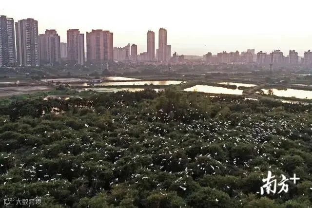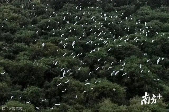 数千只觅食归来的鹭鸟盘旋在竹林上空,蔚为壮观。