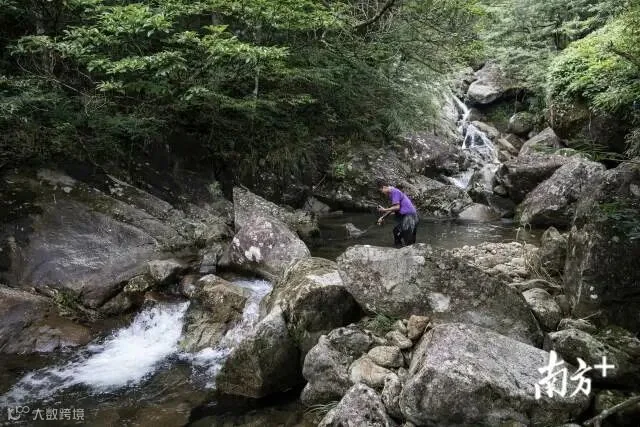 巡护员李家建对万坑河段的溪流进行巡查,查看诱捕的情况。